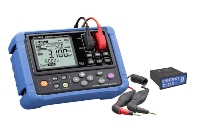 Přenosný tester baterií BT3554-92 je sada skládající se z přístroje BT3554-50, čtyřvodičové sondy L2020 a adaptéru Bluetooth Z3210. Jedná se o nejnovější přírůstek do portfolia přenosných testerů baterií společnosti HIOKI, který čerpá z odborných znalostí získaných od uvedení prvního testeru baterií HIOKI na trh v roce 1986. Tento univerzální tester podporuje dva rozsahy napětí (6 V a 60 V) a čtyři rozsahy odporu (3 mΩ až 3 Ω), což zajišťuje kompatibilitu s širokou škálou velikostí a kapacit baterií. Baterie není nutné pro měření odpojovat od systému, což výrazně zjednodušuje proces testování a také šetří čas.