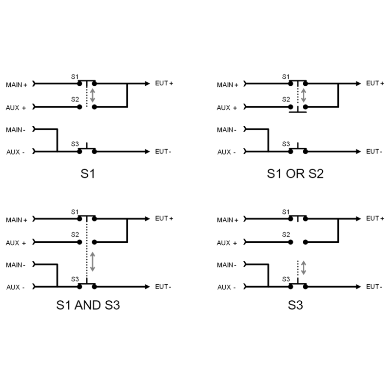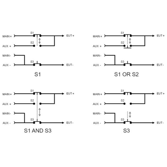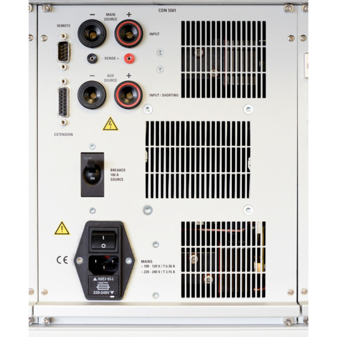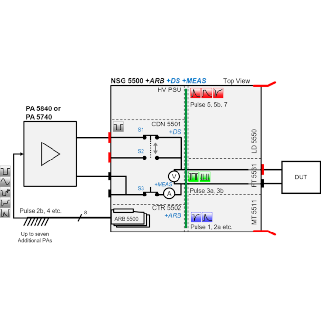 Kromě výpadků, které jsou uvedeny v normách jako je ISO 16750-2, je často v normách mnoha výrobců požadováno provedení velmi rychlého testování výpadku pomocí přepínače. Pro tyto účely jsme zkonstruovali zcela novou možnost +DS. Tento dropout spínač v NSG 5500 +ARB +DS byl kompletně přepracován pro čisté a symetrické spínání na všech třech spínačích: BAT+, BAT- a novém zkratovém spínači (S2) pro evropské požadavky (např. požadavek LV 124). Tento 100 A spínač obsahuje velmi čisté tvary vln se symetrickým spínacím chováním až do 1 µs, a to i při ověření do zátěže pouze 1 kΩ. Při zavřeném stavu měří spínač hodnotu < 100 mΩ a při otevřeném stavu ≈ MΩ. Přepínač má také volitelné měření napětí a proudu pro testování v uzavřené smyčce: nastavte cílovou hodnotu a nechte systém provést všechny potřebné korekce při použití ztrátových nastavení.
