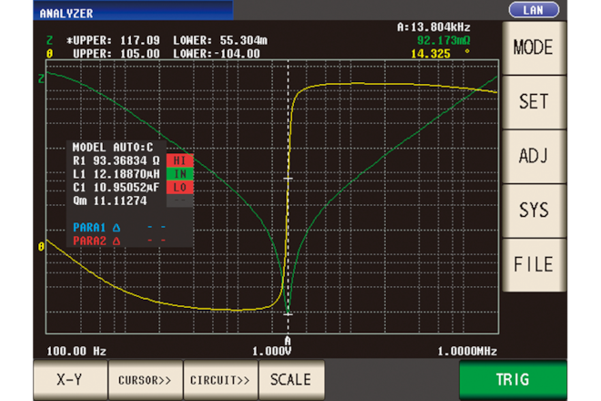 HIOKI IM9000 přidává k impedancnímu analyzátoru IM3570 funkci analýzy ekvivalentního obvodu, což umožňuje podrobné vyhodnocení komplexních impedančních charakteristik. Firmware poskytuje pět reprezentativních modelů obvodů a na základě naměřených dat dokáže automaticky vybrat ten nejvhodnější. Kromě základních tříprvkových modelů R-L-C podporuje také čtyřprvkový model optimalizovaný pro analýzu piezoelektrických zařízení. IM9000 umožňuje přímé generování Nyquistových (Cole-Cole) a admitančních grafů, které poskytují cenné informace o chování závislém na frekvenci a vlastnostech materiálů.