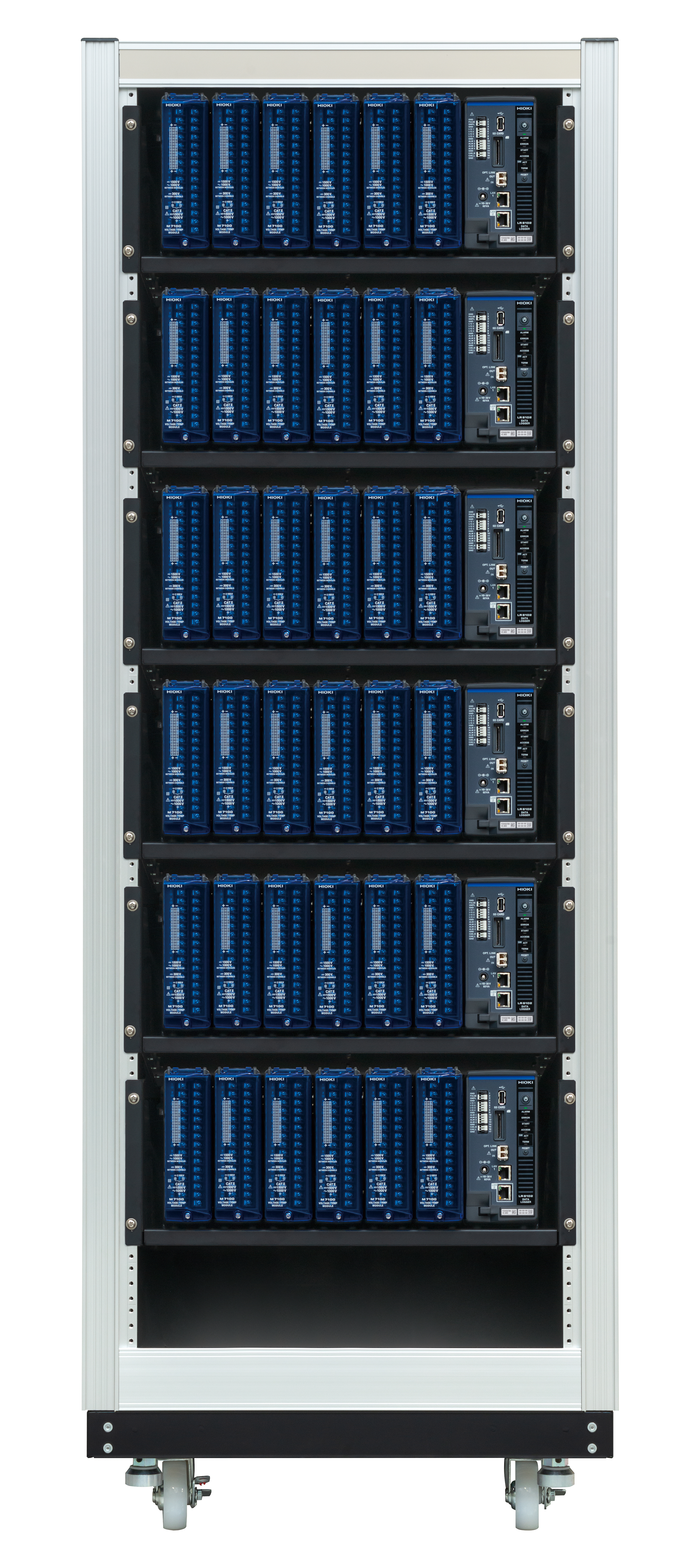 Základní modul LR8102, zajišťující komunikaci s nadřazeným systémem (PC), je nezbytné doplnit alespoň jednou měřicí jednotkou. V případě použití jedné nebo více jednotek (max. ale 4 kusy na logger) pro měření výkonu (M7103) je potom třeba do systému instalovat rovněž napájecí zdroj M1100. Díky optické synchronizaci mezi jednotlivými loggery LR8102 s osazenými vstupními jednotkami je možné sestavit skutečně multikanálový systém s až 3000 kanály: